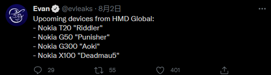 据称,诺基亚 T20 代号为 Riddler,诺基亚 G50 代号为 Punisher,诺基亚 G300 代号为 Aoki,诺基亚 X100 代号为 Deadmau5。