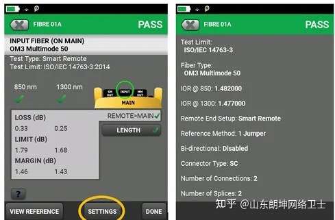 在上文的图1中,我们可以看到根据ISO/IEC 14763-3:2014要求进行测试的测量结果。如果轻触“SETTINGS”(设置)键,则可以查看测试技术人员选择的设置,即右侧的屏幕图像。