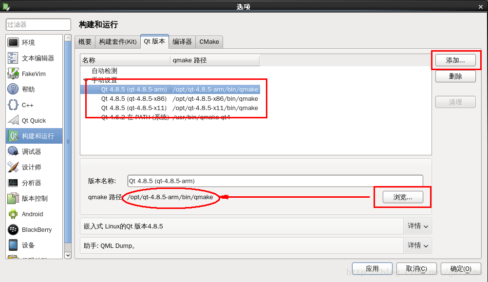 从图中可以看到,IDE并没有自动识别安装的QT,这是因为在缺乏系统环境变量的情况下,不知道程序安装到了什么地方,所以这里需要手动设置,手动设置很简单,只需要点击添加,然后浏览,分别添加编译的三个版本的QT安装文件中的qmake文件即可