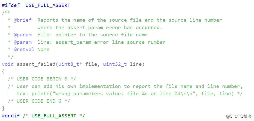 如果要使用,需要定义USE_FULL_ASSERT宏,并且需要自己实现assert_failed函数。特别的,使用STM32CubeMX生成代码的话,会在main.c生成: