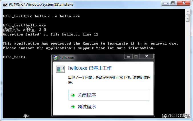 这时候,assert()就派上用场了,以上代码中,我们可以在a = b / c;这句代码之前加上assert(c);这句代码用来判断变量c的有效性。此时,再编译运行,得到的结果为: