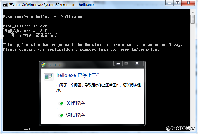 此处,变量c作为分母是不能等于0,如果我们输入2 0,结果是什么呢?结果是程序会蹦: