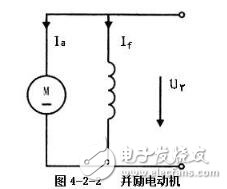 并励电机的励磁绕组是和电枢绕组并联的,如图4-2-2所示。并励电动机励磁绕组的特点是导线细、匝数多、电阻大、电流小。这是因为励磁绕组的电压就是电枢绕组的端电压,这个电压通常较高。励磁绕电阻大,可使If减小,从而减小损耗。由于If较小,为了产生足够的主磁通Φ,就应增加绕组的匝数。