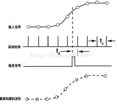 数字存储示波器在一个触发信号到来之后,以一个特定的速率迅速采集触发信号之后的波形,如下图所示。