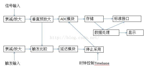 现在大家说的数字实时示波器,一般是指数字存储示波器。大家可以关注一下自己的示波器上有没有写Digital Storage Oscilloscope。数字存储示波器和模拟示波器电路类似,分为水平控制部分和垂直控制部分,比模拟示波器多了显示处理部分。垂直控制部分包括信号前置预处理电路(放大或者衰减)、垂直方向预放大电路、ADC、存储单元、数据处理部分;水平控制部分包括衰减和放大电路、触发比较电路、延迟电路以及采样控制电路;显示处理部分主要将采样数据经过处理后输出到显示器上。具体原理图如下: