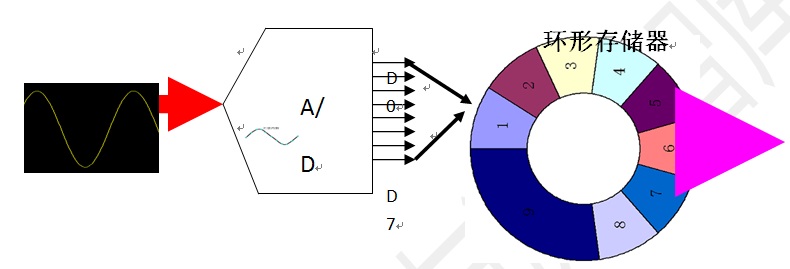 存储器保存满了,达到存储深度的极限之后怎么办?我们可以将示波器的存储器理解为环形存储器。示波器不断采样得到新的采样点会填充进来,老的采样点会自动地溢出,这样周而复始的过程直到示波器被“触发信号”“叫停”或者间隔一定长的时间被强迫“叫停”为止。“叫停”一次,示波器就将存储器中保存的这些采样点“搬移”到示波器的屏幕上显示。这两次“搬移”之间等待的时间相对于采样的时间极其漫长,被称为“死区时间”。