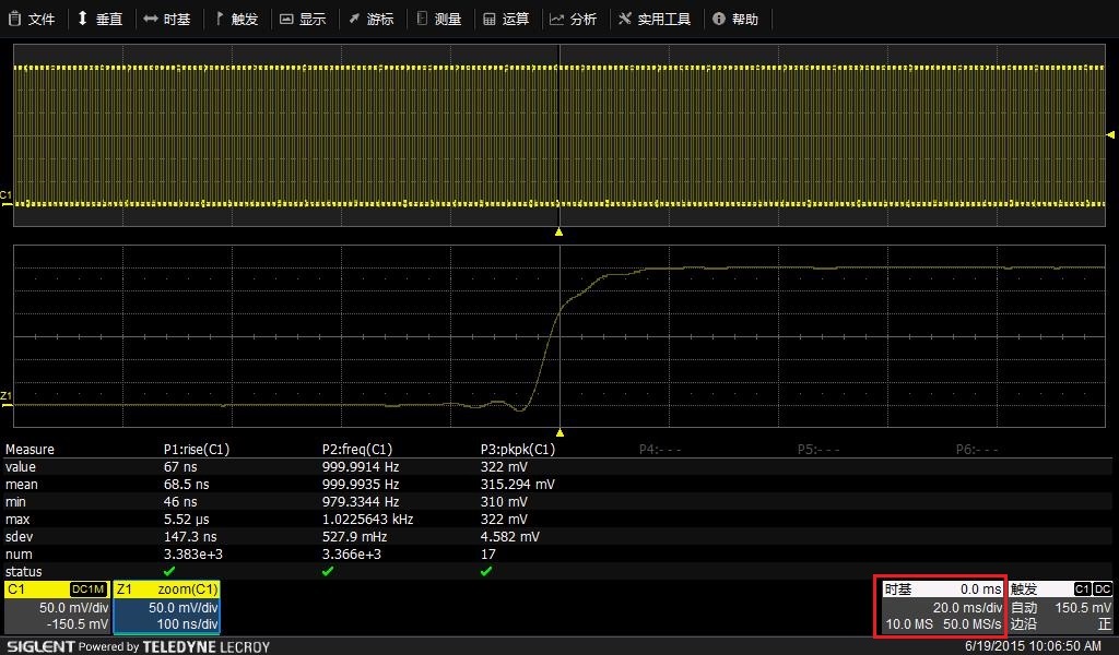 存储深度=采样率*采样时间。笔者一直执着地将它称为示波器中的第一关系式,因为很多工程师在使用示波器过程中因为忘记这个关系式而产生错误。如图2为中国首款智能示波器SDS3000的显示界面。右下方红色方框中,右边两个数值50MS/s和20ms/div相乘,再乘以10,就等于左边的数10MS。当前采样率为50MS/s,当前时基为20ms/div,因为水平轴是10格(有些示波器是12格或14格),因此采样时间为200ms, 50MS/s * 200ms = 10MS。就是说以50MS/s的采样率捕获200ms的波形,需要示波器的存储深度是10MS。