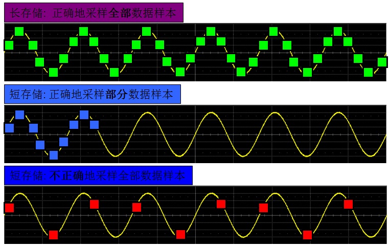 下面的示意图也清晰地演绎了这个关系式的重要性。第一个图形表明在采样率足够的前提下观察多个周期的样本,需要的存储深度深度很长,图示中需要36个采样点。第二个图形采样率依然保持不变,但存储深度变小,只有9个采样点,因此只能采样一个周期多点的波形。第三个波形仍然是存储深度很小,只有9个采样点,但仍然要采样和第一个图形一样多个周期的波形,其结果是采样率变小,测量得到的波形就会失真。