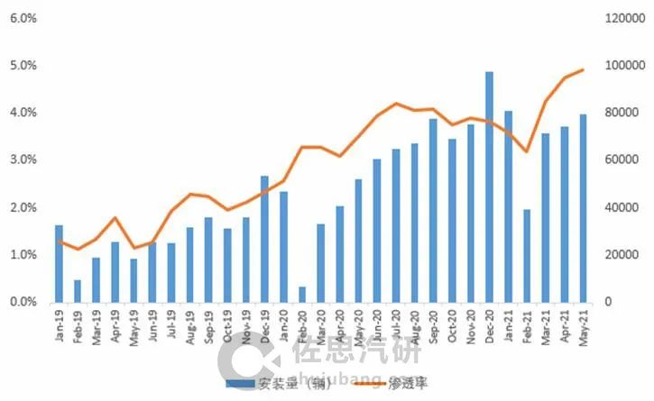 2019-2021年国内乘用车 HUD安装量及渗透率(分月度)