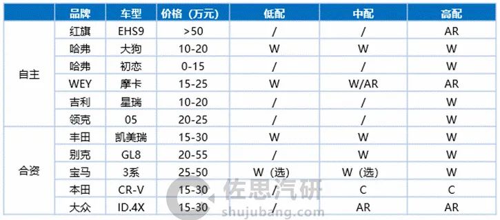 备注:C/W/AR分别代表C-HUD/W-HUD/AR-HUD;“/”代表未装配