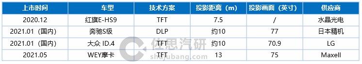华为:2021年4月发布基于LCOS投影技术的AR-HUD,VID为7.5米,视场角为13°x 5°,显示画面达到70寸。与DLP技术相比,体积大幅缩小,只有10L,并能在普通挡风玻璃上直接使用,而无需对挡风玻璃进行特殊处理。