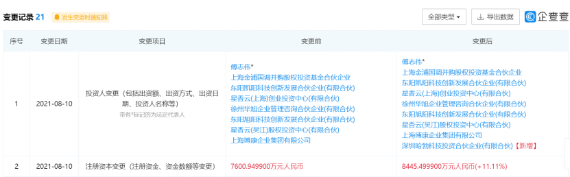 企查查显示,8月10日,徐州博康信息化学品有限公司(以下简称“徐州博康”)发生多项变更。其中,投资人新增深圳哈勃科技投资合伙企业(有限合伙),注册资本从“7600.9499万元”增加到“8445.4999万元”。