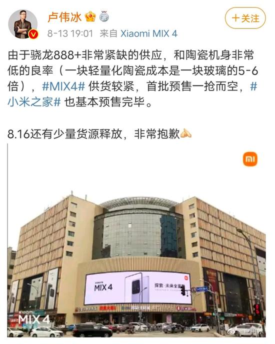 值得一提的是,8月13日,小米集团中国区总裁、Redmi品牌总经理卢伟冰发文称,由于骁龙888 Plus非常紧缺、陶瓷机身非常低的良率,小米MIX 4供货较紧,首批预售一抢而空,小米之家也基本预售完毕,对此表示非常抱歉。