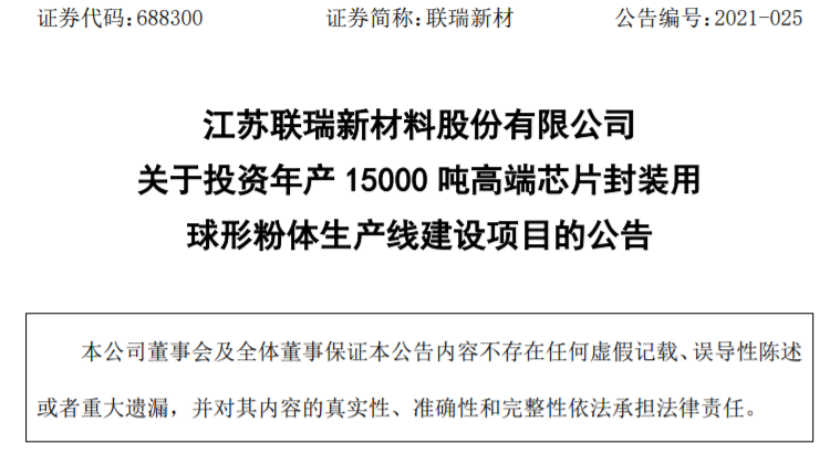 2021年08月16日 | 联瑞新材:拟投3亿元建高端芯片封装用球形粉体生产线