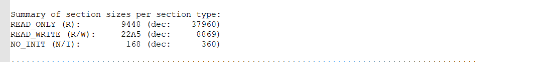 在SECTION-ALLOCATION SECTION的最后是所有段所占RAM和Flash大小的统计结果:其中READ_ONLY(R) 为Flash的大小,而 READ_WRITE(R/W)为RAM大小: