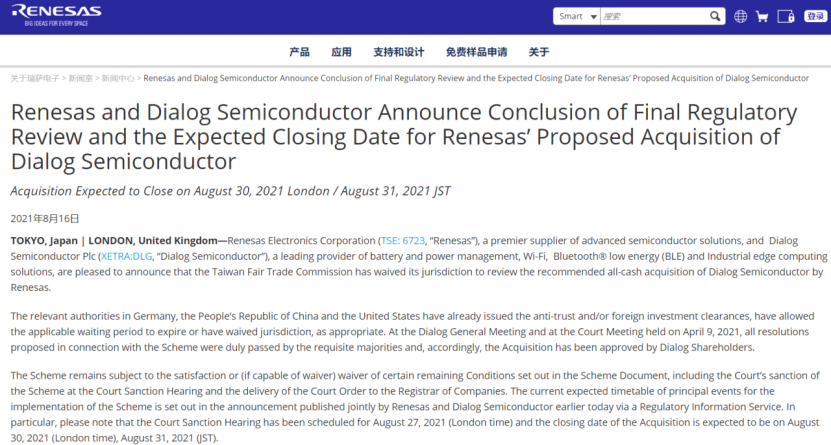 8月16日,瑞萨电子(Renesas)宣布,中国台湾地区“公平交易委员会”已经放弃对其并购Dialog案的审查。