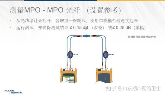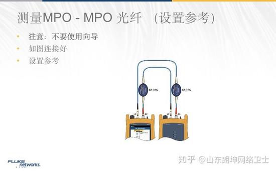 三跳线设置参考,顾名思义,需要用到三条跳线进行参考设置。如上图所示,以多模为例,左边是光源,右边是光功率计,在设置参考时,将3根跳线连接在一起设置参考,设置参考后,将中间的参考跳线撤下来,替换成被测链路,这样测的结果不包含连接器1和连接器2的损耗,因此,三跳线设置参考的方法适合于测量通道光纤链路及MPO链路。不难发现,这样测量结果还比实际结果小一些,因为撤下来一根跳线,因此所用的参考跳线,尤其是中间的短跳线,质量的好坏会直接影响测量结果的偏差大小。为此,福禄克网络测试设备引入TRC验证功能,以确保使用的TRC,也就是参考跳线是合格的。接下来,我们以MPO链路的测试,来看看三跳线设置参考的具体操作步骤。
