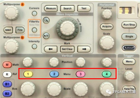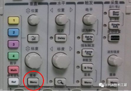 示波器的垂直系统参数,除了垂直刻度和垂直位置外,其它参数设置都在示波器通道菜单内,通道菜单在垂直系统中常用一个“Menu”按键打开,该按键在示波器的垂直系统区域,如没有这个按键,就用“CH1、CH2、CH3、CH4”、“1、2、3、4”或“A、B、C、D”等打开,如图: