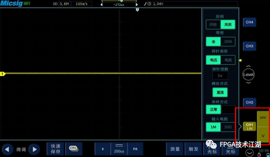 便携示波器:点击垂直区域的“Menu”键,打开相应菜单。打开通道菜单后选择相应项进行设置。