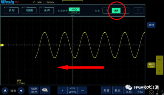 通常可以在示波器的“显示/采样/水平”菜单里选择,以“Roll”或“滚屏”为标志,也有的示波器设有专用按键,在操作面板上以“Roll”表示。