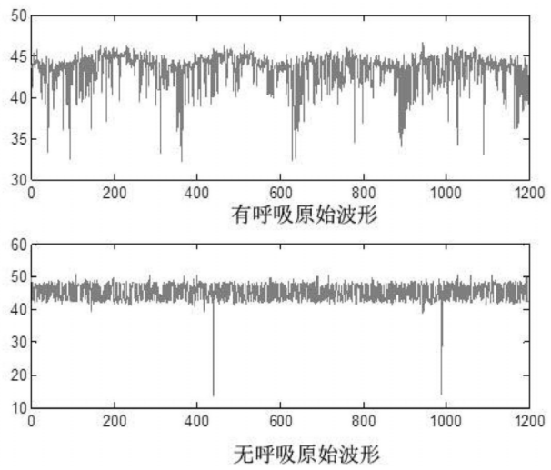 如上图,为该专利中展示的由呼吸频率检测装置得到的有呼吸状态和无呼吸状态波形图,可以看到有呼吸的原始波形振幅波动较大,而无呼吸原始波形较为平稳。在该专利中也描述了如何判断有呼吸状态和无呼吸状态,即:当同一个子载波的最大值的方差和最小值的方差都大于0.2,并且所有子载波均值大于0.2时,判断为有呼吸,否则判断为无呼吸。