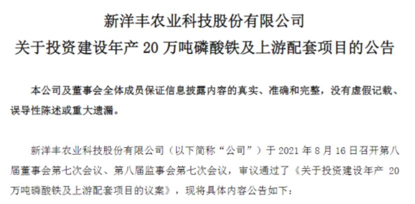 2021年08月20日 | 磷酸铁锂成了香饽饽,磷化工龙头新洋丰砸30亿元入局