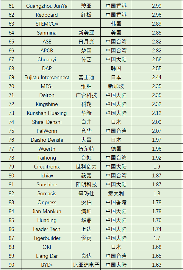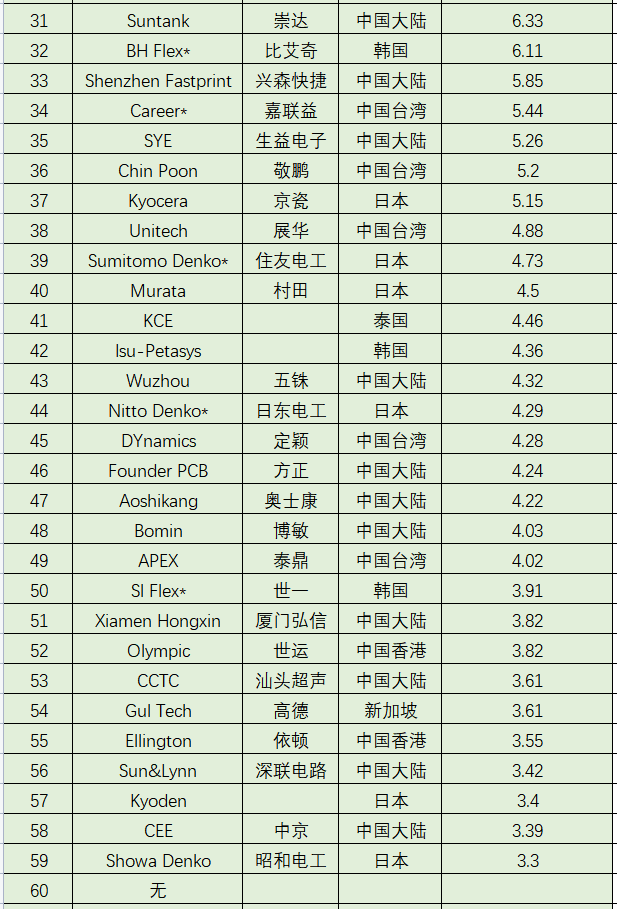 全球PCB业界调研权威N.T.Information总裁中原捷雄(Hayao Nakahara)发表NTI-100 2020 全球百大PCB 排行与业界动态(NTI-100:年营业额超过100百万美元),根据他的调查报告,2020年共有128家制造商营收超过1亿美元进入名单内,较2019年122家成长6家,产值从623.42 亿美元成长到687.89 亿美元,成长率10.3%。各区域入榜家数与去年家数相比分别为中国大陆55家、中国台湾25家、日本21家、韩国14家、美国4家、欧洲5家、东南亚区域3家。