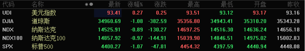 美股方面,道琼斯工业平均指数下跌382.59点,跌幅为1.08%,报34960.69点。纳斯达克综合指数小幅下跌130.27点,跌幅为0.89%,报14525.91点。标准普尔500指数下跌47.81点,跌幅为1.07%,报4400.27点。