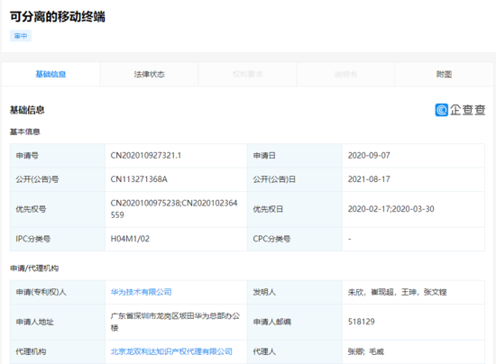 华为技术有限公司在近日公开了一项“可分离的移动终端”专利,专利号为 CN113271368A,申请日期为 2020 年 9 月。