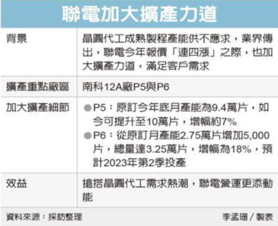 晶圆代工成熟制程产能供不应求,业界传出,联电今年报价「连四涨」之际,南科12A厂P5与P6同步加大扩产力道。其中,P5将较原订目标增加7%产能,今年底前到位,规划2023年第2季投产的P6月产能也将较原目标提升18%,P5、P6合计月产能将较原规划多1.1万片,营运更添动能。