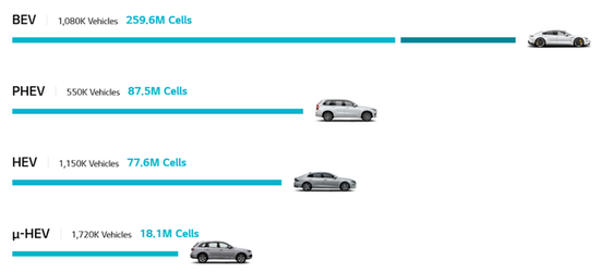BEV 108万台,2.596亿个电芯。(目前现代KONA的起火事故10+,GM的Bolt EV起火事故10+,大众汽车1、捷豹路虎1,大致计算可能在30+个。起火的概率为1/3万。这个数据比特斯拉21700的高一些。)PHEV 55万台,0.875亿个电芯,主要包括GM、Volvo、奥迪和吉利的插电式混动,我印象中P1.1、P2.6这个系列没有发生过任何的起火事故。HEV 115万台,一共7760万电芯,主要为现代等供应。48V 17.2万台车,1810万支电芯,主要给BMW、Volvo等企业提供48V电池。