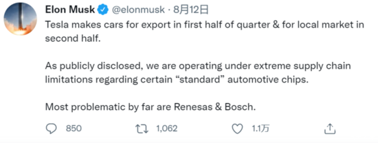 从逻辑上来看,影响是无差别的,不管是油车还是电车,以至于埃隆·马斯克在Twitter上公开点名瑞萨电子和博世,认为对于特斯拉的生产来说,这两家芯片公司是目前特斯拉供应链上的最大问题和瓶颈。从这个意义上来看,事情已经严重到一定程度了,瑞萨其实在国内已经“躺倒”很久,主要是保障海外和日系的供应。