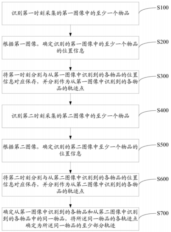 最后,确定从第一图像中识别到的各物品和从第二图像中识别到的各物品中的同一物品,将同一物品的各轨迹点确定为同一物品的轨迹。由此,即刻实现对于用户进行标定物品的识别以及跟踪。