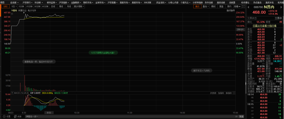 8月23日,普冉股份在上交所科创板正式挂牌上市,公司证券代码为688766,发行价格148.9元/股,截至发稿前,普冉股份股票报价468元/股,涨幅214.3%,总市值达169.6亿元。