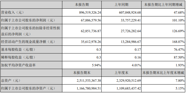 集微网消息 8月23日,新莱应材发布半年报称,2021年上半年,公司实现营业收入为8.97亿元,同比增长47.68%;归属于上市公司股东的净利润为6789万元,同比增长101.10%。