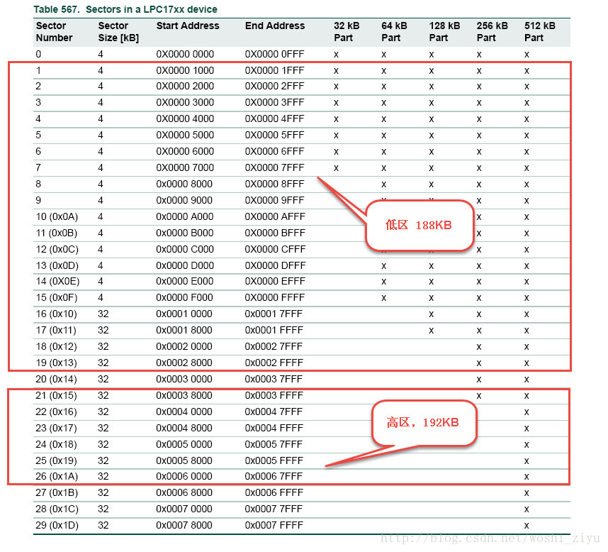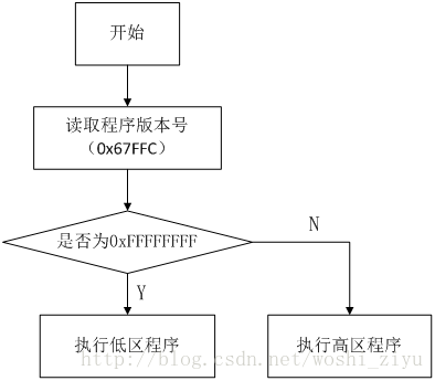 在高区程序的最后四个字节(0x67FFC)存储着程序的版本信息,程序通过判断高区程序的版本信息实现跳转,如果版本信息为0xFFFFFFFF,则认为高区程序无效,程序执行低区用户程序,否则,执行高区程序。