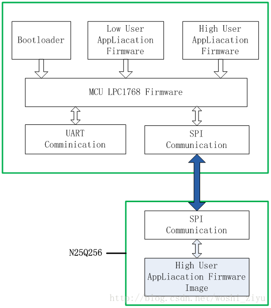 待更新的程序放置于外部存储芯片N25Q256的0x00100000处,并占据48个扇区。LPC1768的bootloader通过SPI的方式读取N25Q256的数据并更新程序至高区用户程序,更新成功后,程序复位,运行更新后的程序。