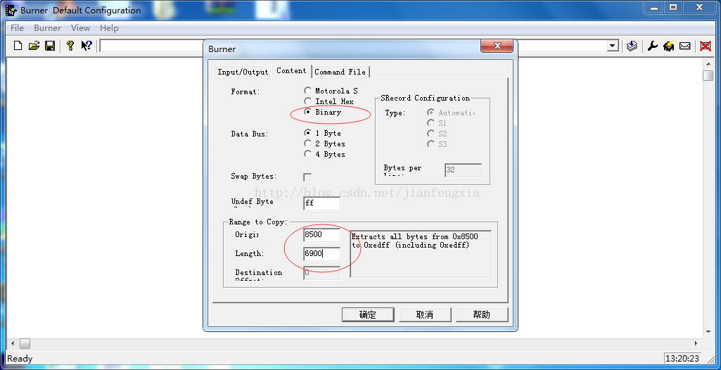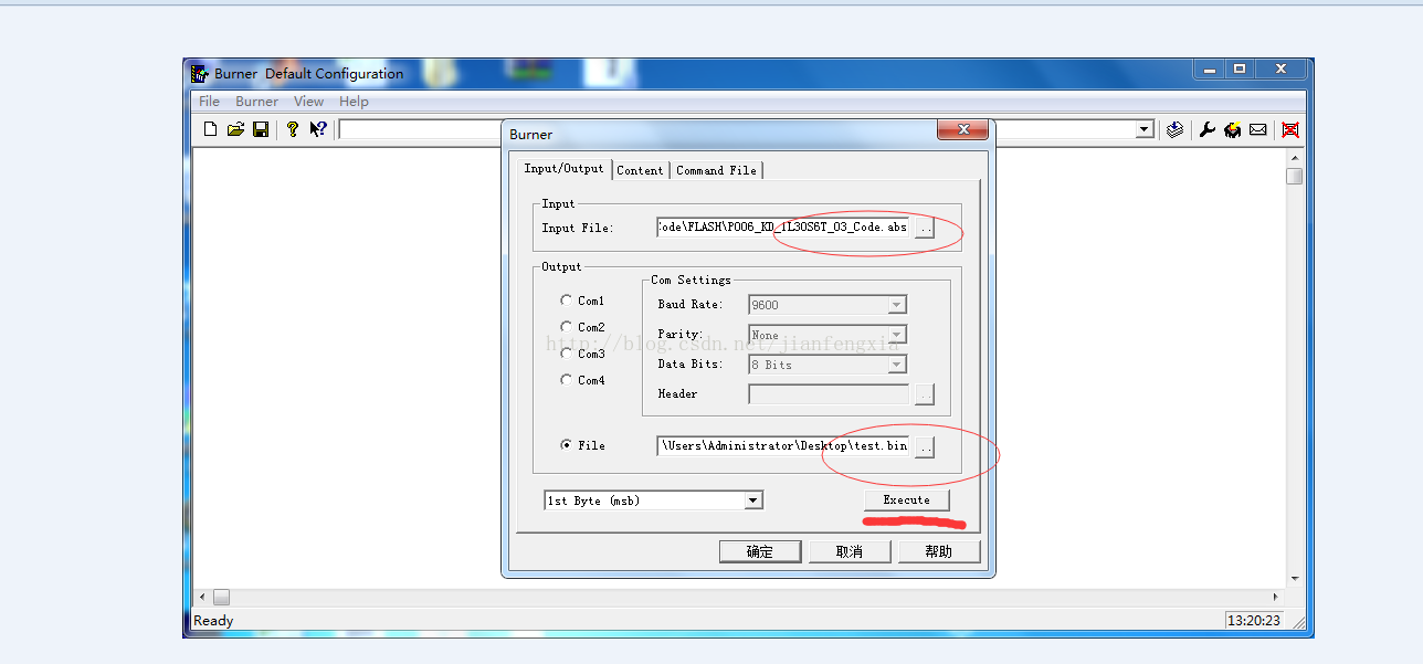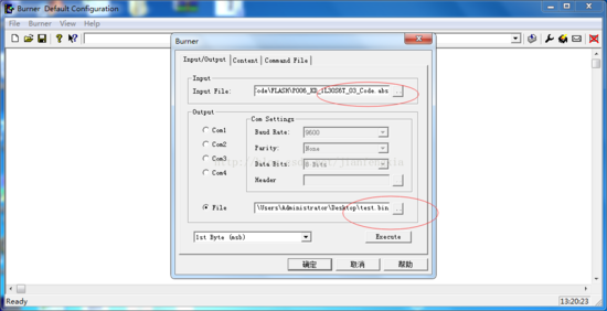 点击burner dialog,选择input file(生成的abs文件),选择file(转换后文件储存路径及名称)如下图