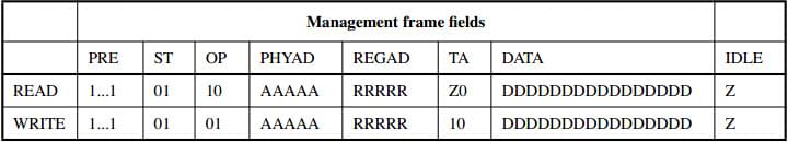 一个标准的MDIO帧包括PRE,ST,OP,PHYAD,PEGAD,TA和DATA段,如下图所示。