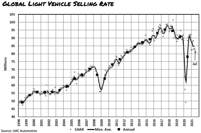 LMC的报告是按月度数据来分析的。今年7月份,全球的乘用车销量为646.3万辆,比2020 年 7 月的 689.9万台下降了6.3%,这个数据不太好看。