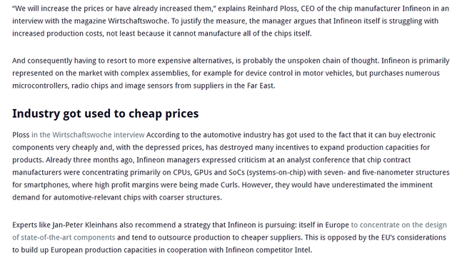 在汽车行业血流成河的时候,英飞凌的管理层开始展现了让人觉得很无奈的事情:一方面英飞凌在提高芯片的价格,另一方面又说,正是由于汽车厂家习惯用较低价格来采购汽车芯片,才摧毁了汽车芯片企业扩大生产能力的意愿。英飞凌觉得汽车芯片的价格还不够高,关于这点中国的芯片企业肯定有话说。