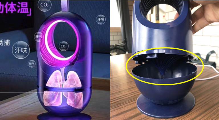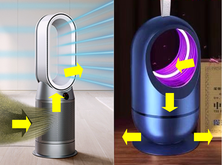 看看气流方向,空气净化风扇的空气从下至上经过滤网,顺理成章;而灭蚊器相反,空气是由上至下流动。进去的空气肯定是没有诱蚊“味道”的,如果说灭蚊器真会产生诱蚊因子,还不是会随风向从底座部分出来?那蚊子闻到出风口处的“味道”,又感觉到“人体温度”是不是都会集中在这里?进风口没有蚊子,之后的大吸力、杀死蚊子也就无从谈起了。