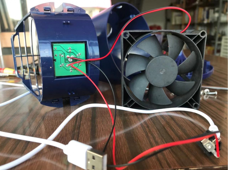 从外壳上取下接USB电源线插孔。里面简单的不能再简单了,一点儿技术含量都没有,就是一个小风扇加上一个灯。通过一块小印制电路板将USB线连接到LED灯和风扇。风扇取下来后,里面的出风口模组就可以拿下来了。