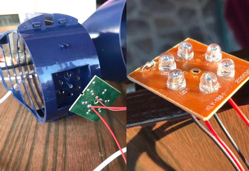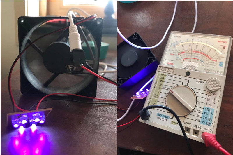 用万用表测了一下,USB的输出是4.3V,问题来了,这么低的电压能够驱动杀死蚊子的紫外线灯(这里是紫光LED)吗?紫外线灯灭蚊器都是用交流电,否则无法点亮,也无法用高电压电击蚊虫。