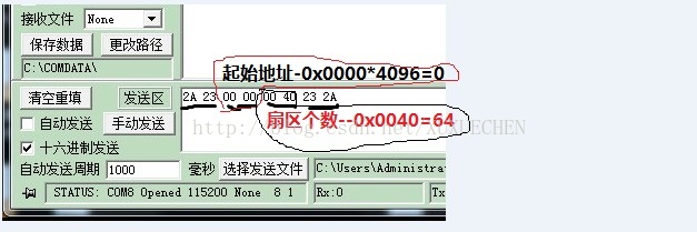addr=RS232_RX_BUF[2]*256+RS232_RX_BUF[3]; //addr为接收到的起始地址所在扇区,也就是说是第几个扇区