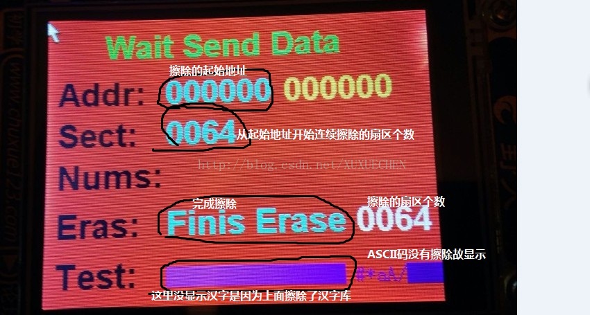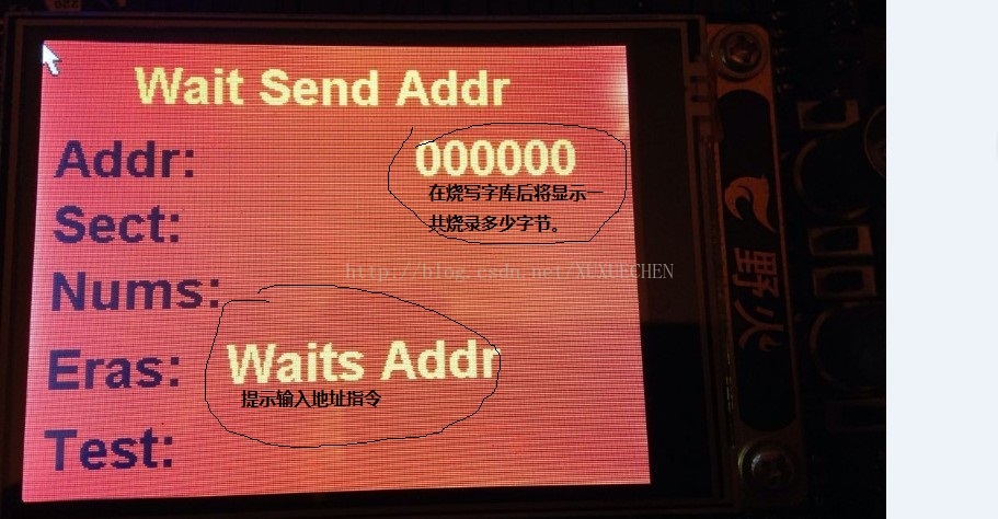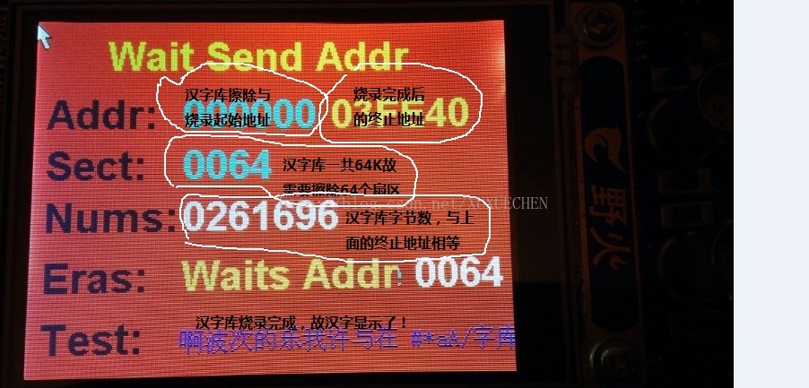 for(i=0;i Erase_adrr=addr+i;//扇区地址自增---这里自己试验的时候不小心把addr写成了Erase_adrr,导致调试好久,最后一步一步添加验证才找到问题,不过在这个过程中加深了自己对FLASH的了解! SPI_FLASH_SectorErase(4096*Erase_adrr); //擦出扇区 GUI_SetColor(GUI_WHITE); GUI_DispDecAt(i+1,255,160,4);// 显示实时擦除扇区状态---第几个 Delay_Ms(50); } GUI_SetColor(GUI_CYAN); GUI_DispStringAt("Finis Erase",100,160); GUI_SetFont(&GUI_FontHZ16); GUI_SetColor(GUI_DARKMAGENTA); GUI_DispStringAt("啊波次的乐我许与在 #*aA/字库",100,210);//这里是用来测试前面的擦出是否完成---比如前面擦出了ASCII码的字库地址,其中的FLASH就不会显示 CK_flag=10; //串口接收数据是否是地址的的标识判断位 ---为10 表示后面接收的是数据 GUI_SetFont(&GUI_Font32B_1); GUI_SetColor(GUI_GREEN); GUI_DispStringAtCEOL("Wait Send Data",50,10); while(GPIO_ReadInputDataBit(GPIOA,GPIO_Pin_1) == 0); //这里等于是一个开关---用来等待串口传输完成,可以再串口上看到是否传输完成 GUI_SetColor(GUI_WHITE); GUI_DispDecAt(addr_i,100,120,7); GUI_SetFont(&GUI_FontHZ16); GUI_SetColor(GUI_BLUE); GUI_DispStringAt("啊波次的乐我许与在 #*aA/字库",100,210);//这里是用来测试前面的烧写是否完成---比如前面擦出了ASCII码的字库地址这里又重新烧录了ASCII码,其中的FLASH就会再次显示 Delay_Ms(100); GUI_TOUCH_Exec(); GUI_Exec(); } } --------------串口中断函数------------ void USART1_IRQHandler(void) { uint8_t res; if(USART_GetITStatus(USART1, USART_IT_RXNE) != RESET) //接收到数据 { USART_ClearITPendingBit(USART1, USART_IT_RXNE); res=USART_ReceiveData(USART1); //读取接收到的数据 RS232_RX_BUF[RS232_RX_CNT++]=res; //接收数据,主要保存地址指令 if(CK_flag==10) //串口接收数据 { addr_i++; //烧写地址自增---主函数中将在烧写完成后显示 SPI_FLASH_BufferWrite(&res,addr++,1); //烧写接收到的数据到FLASH } if( RS232_RX_CNT==12)//无影响 RS232_RX_CNT=0; } } ---------------------实验实物图片---------------------- ----标识显示----- -----指令---擦除0x000000起始的连续64个扇区 ----上面擦除的是汉字库的内容---故下面汉字没有显示--- ----重新烧录汉字库,一共261696个字节数据---大约64K--- -----烧录完成,汉字又显示了---- ----指令----擦除0x050000起始的一个扇区--- -----擦除了ASCII码地址内容,故ASCII码没有显示-- -----重新烧录ASCII码库,一个4096个字节数据,刚好4K--- ----烧录完成,ASCII码再次显示----