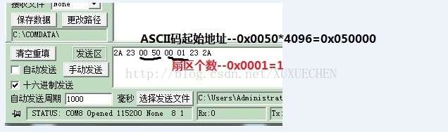 主要功能是----启动开发板,首先写入地址指令----必须十六进制----比如---2A 23 00 05 00 03 23 2A-----其中2A,23为验证码,前后都有,第3,4位是地址码,前面就表示将要写入的起始地址是0x05*4096,第5,6位是为了写入数据将要从起始地址连续擦除的扇区个数,前面就表示0x0003个。