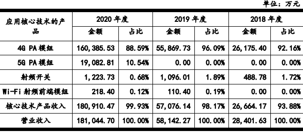 为此,唯捷创芯回复称,2018年-2020年,其核心技术产品贡献收入占主营业务收入的比重均在90%以上,占比不断提升,主要系发行人应用于4G或5G的PA模组产品收入快速增长,同时发行人逐步退出未使用最新核心技术的2G/3GPA模组市场所致。具体如下: