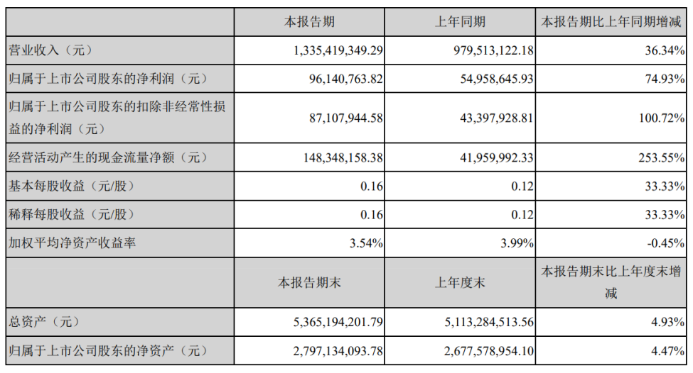 8月24日晚间,中京电子披露2021年半年度报告,报告期内公司实现营业收入13.35亿元,同比增长36.34%;实现归属于上市公司股东净利润9614.08万元,同比增长74.93%;实现扣非净利润8710.79万元,同比增长100.72%;经营活动产生的现金流量净额为1.48亿元,同比上升253.55%。