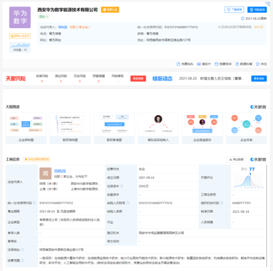 天眼查App显示,8月24日,西安华为数字能源技术有限公司成立,注册资本2000万元人民币,法定代表人为周桃园,经营范围为在线能源计量技术研发;电力行业高效节能技术研发;能量回收系统研发等,此外,该公司由华为技术有限公司间接全资持股。